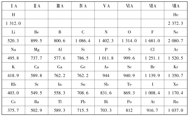 表2.8 主族元素原子的第一电离能(单位:kJ/mol)