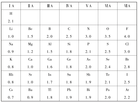 表2.9 ⅠA—ⅥA 主族元素的电负性数值