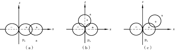 (3)成键原子轨道重叠时,必须符号相同,才能重叠增大电子云密度。除s 轨道外,p,d,f 轨道都有方向性,所以成键原子需按一定方向接近时才能最大程度重叠,如图3.3(a)所示,px轨道和s 轨道沿着对称轴方向最大程度重叠。图3.3(b)中重叠部分抵消,图3.3(c)中重叠很少。共价键尽可能采取电子云密度最大的方向形成,这称为原子轨道最大重叠原理。