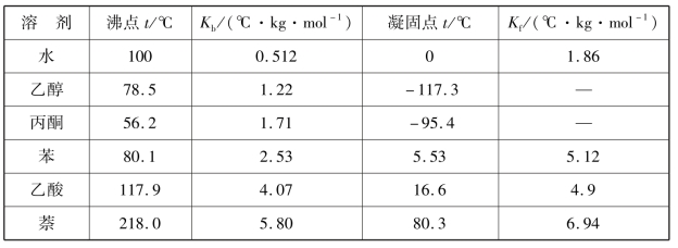 式中,ΔTb 为沸点升高数值;bB为溶液的质量摩尔浓度;Kb为溶剂的质量摩尔沸点升高常数,它是溶剂的特征常数,因溶剂的不同而不同。Kb值可以理论推算,也可以实验测定,其单位是℃·kg/mol 或K·kg/mol。几种常见溶剂的Kb值见表4.3。