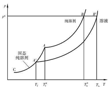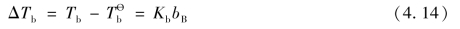 从图4.2中可见,在TӨb 时溶液的蒸气压和外界的大气压(101.3 kPa)并不相等,只有在大于TӨb 的某一温度Tb时才能相等。换言之,溶液的沸点要比纯溶剂的沸点高。很明显,其升高的数值与溶液蒸气压下降的多少有关,而蒸气压下降又与溶液的质量摩尔浓度成正比,可见沸点升高也应和溶液的质量摩尔浓度成正比。即