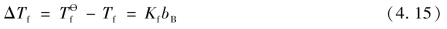 式中,ΔTf为凝固点降低数值;Kf为溶剂的质量摩尔凝固点降低常数,也是溶剂的特征常数,因溶剂的不同而不同,其单位是℃·kg/mol 或K·kg/mol。几种常见溶剂的Kf值见表4.3。