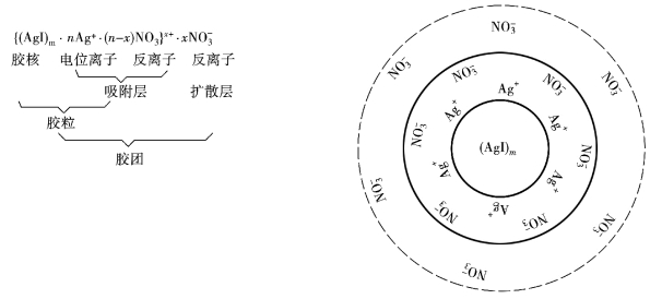 (4)胶团的结构。溶胶的性质与其结构有关,人们根据大量实验提出了溶胶的扩散双电层结构。下面以AgI 溶胶为例,讨论胶团的结构。首先Ag+与I-反应后生成AgI 分子,由大量的AgI 分子聚集成粒径为1~100 nm 的颗粒,该颗粒称为胶核。由于胶核颗粒很小,分散度很高,因此,具有较高的表面能。若此时体系中存在过剩的离子,胶核就要有选择地吸附这些离子。若体系中AgNO3 过量,根据“相似相吸”的原则,胶核优先吸附Ag+而带正电。被胶核吸附的离子称为电位离子。此时因胶核表面带有较为集中的正电荷,故它会通过静电引力吸引带负电荷的NO3-。人们常将这些带相反电荷的离子称为反离子。电位离子与反离子组成吸附层,胶核与吸附层组成胶粒,而胶粒与部分反离子(分布在胶粒周围,称为扩散层)形成不带电的胶团。如图4.8所示,为AgI 胶团的结构式及其示意图。