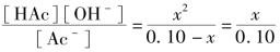 忽略水的电离,可认为x=[OH-]=[HAc],由于KӨh 很小,可近似认为0.10-x≈0.10,