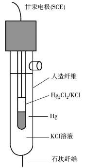 这是一类金属-难溶盐电极。它由两个玻璃管组成,内套管下部有一多孔素瓷塞,并盛有汞和甘汞Hg2Cl2 混合的糊状物,在其间插有作为导体的铂丝。在其外管中盛有饱和KCl 溶液和少量KCl 晶体(以保证KCl 溶液处于饱和状态);外玻璃管的最底部也有一多孔素瓷塞。多孔素瓷允许溶液中的离子迁移。