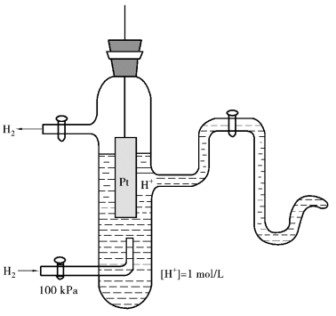 将表面镀上一层多孔铂黑(细粉状的铂)(镀铂黑的目的是增加电极的表面积,促进对气体的吸附,以利于与溶液达到平衡)的铂片,浸入氢离子浓度为10 mol/L 的酸溶液中(如HCl 溶液),在298 K 时不断通入压力为100 kPa 的纯氢气流,使铂黑电极上吸附的氢气达到饱和。这时,H2 与溶液中H+可达到平衡: