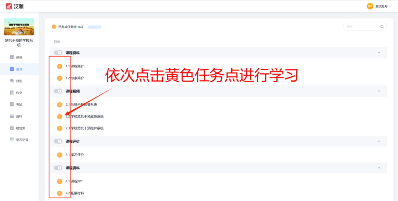 (说明:该章节学习之后,任务点会由黄色变成绿色)
