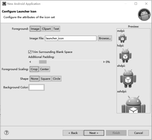 步骤3:单击“Next”按钮,进入启动图标配置界面,如果程序的logo还没设计好,可先不配置,直接单击“Next”按钮,如图2-17所示。