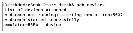 注意,这里的“emulator-5554”表示目前连接到计算机上设备的Device ID,不同的手机显示的值是不同的。