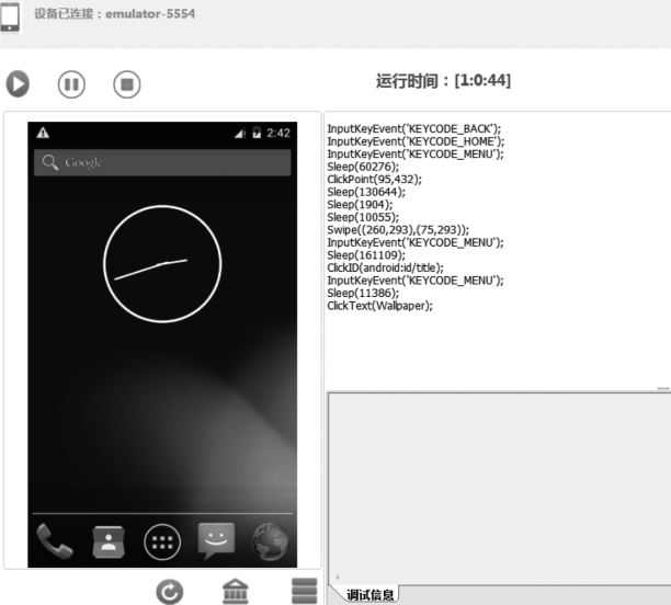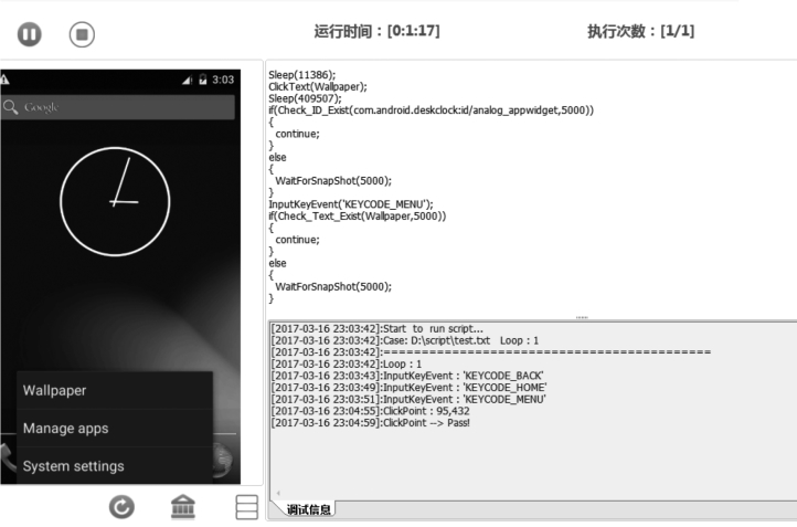 设置完执行次数后单击“确认”按钮。iTest将开始执行刚录制的脚本内容,同时会显示脚本执行时间、当前的执行次数,debug窗口会输出脚本执行过程中的日志信息,如图10-60所示。