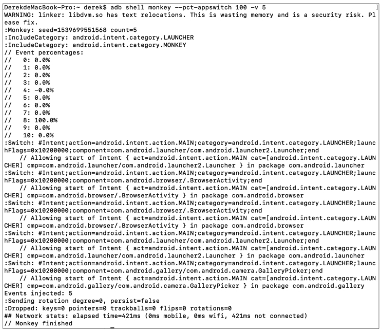 (2)-v表示打印出日志信息,Monkey最多支持3个-v,每多一个-v表示增加一个级别的信息。