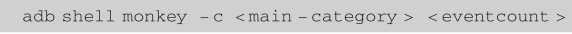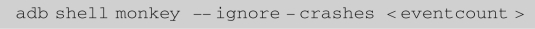 现在看一下图10-2中“usage”后面的内容。“[]”里的参数都是可选的,也就是说不选也可以启动Monkey测试。最后一行的“COUNT”是不在“[]”里的,是个必选的参数。前面的命令行里并没有COUNT值,因此,需要把COUNT值加进来,其运行效果如图10-3所示。