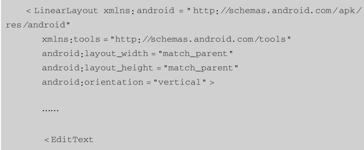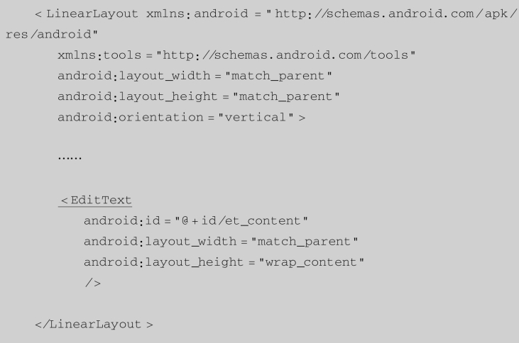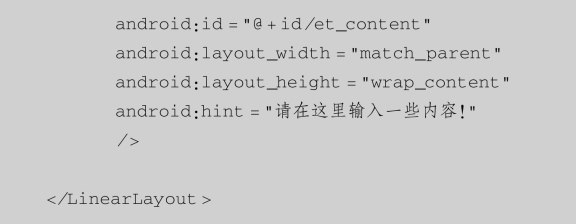 EditText在开发中也是经常使用的控件,比如,要实现一个登录界面,需要用户输入账号、密码等信息,然后程序获得用户输入的内容,把它交给服务器来判断,这些操作都离不开EditText。下面介绍如何在界面中加入EditText,修改“activity_main.xml”文件的代码如下: