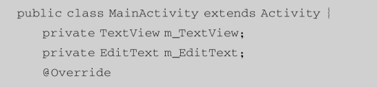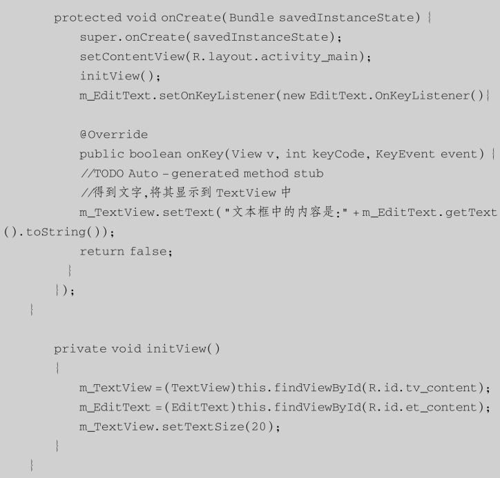 还可以结合TextView和EditText来完成另外一些功能,比如,当用户输入信息后,程序获得用户输入的内容,显示在TextView中。修改“MainActivity.java”文件中的代码如下: