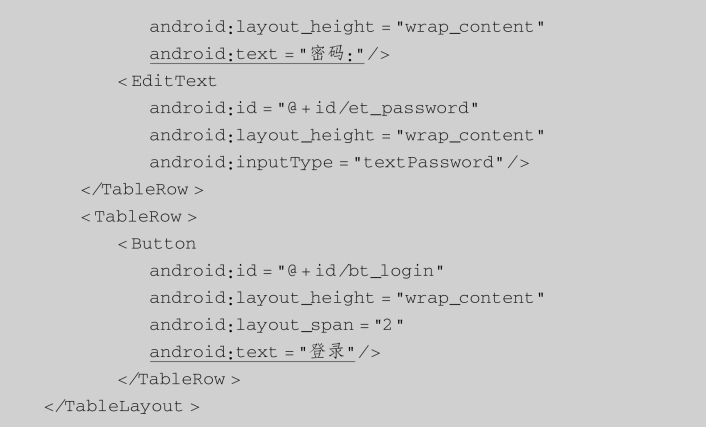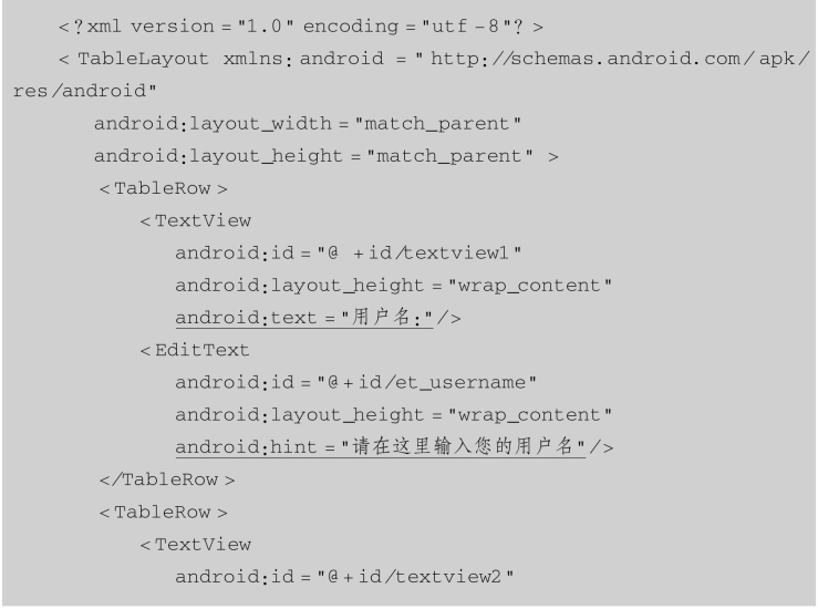 下面通过一个登录界面的实例,具体介绍TableLayout的使用。修改“activity_main.xml”文件的代码如下: