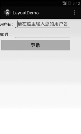 从上面的代码可以看到,在TableLayout中一个TableRow表示在表格中添加一行,在TableRow中加入一个控件,就表示在该行中加入一列,并且在TableRow中不需要指定控件的宽度。在这个实例中,在第一行添加了一个TextView和一个输入用户名的EditText,在第二行添加了一个TextView和一个用于输入密码的EditText,输入密码的时候一般都会以“*”号显示,因此这里为EditText添加了android:inputType属性,并且将其指定为textPassword,这样就把当前的EditText控件变成了密码输入框。在第三行添加了一个Button控件,并且将其android:layout_span属性指定为2,表示该Button控件将占据两列的空间,这样既保证了表格结构的合理性,又保证了界面的美观。重新运行程序,效果如图5-21所示。