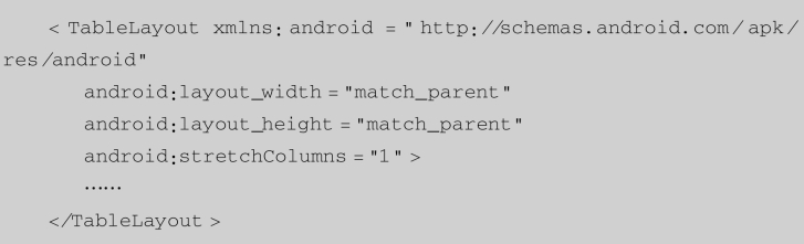 TableLayout自然离不开行和列,它可以将子控件的位置分配到行或列中。Android系统的一个TableLayout由许多TableRow组成,每个TableRow都会定义一个Row。TableLayout容器并不会显示Row、Column或Cell的边框线。表格由行和列组成许多单元格,允许单元格为空。单元格不能跨列,这与HTML中不一样。列可以被隐藏,也可以被设置为伸展的,从而填充可利用的屏幕空间,也可以设置强制列收缩,直到表格匹配屏幕大小。