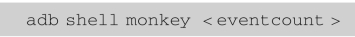现在看一下图10-2中“usage”后面的内容。“[]”里的参数都是可选的,也就是说不选也可以启动Monkey测试。最后一行的“COUNT”是不在“[]”里的,是个必选的参数。前面的命令行里并没有COUNT值,因此,需要把COUNT值加进来,其运行效果如图10-3所示。