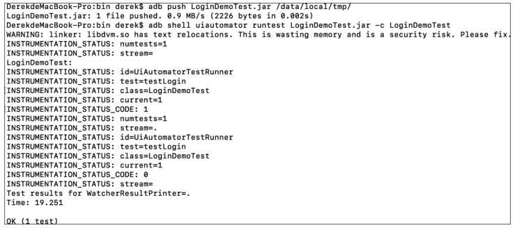 (6)在手机端执行自动化测试脚本中的测试用例,命令如下:
