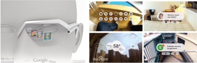 而如今的一些智能产品的视觉交互不仅仅是传统意义上被动的视觉交互,产品能够根据人眼球移动的轨迹去理解命令,在这一过程中人的视觉是主动提供信息而智能产品要接收我们的信息加以分析。谷歌眼镜(如图1-6所示)是一款新型的视觉交互智能产品。这款智能产品将智能手机所包含的功能全部浓缩到眼镜之中,通过用户眼睛上的动作,来进行视觉上的交互,用户可以用眨眼、视觉转移、关注物体等眼睛上的动作,来完成一些智能手机上类似发短信、打电话、照相等操作,使用户可以随时随地轻松地处理各种日常事务。