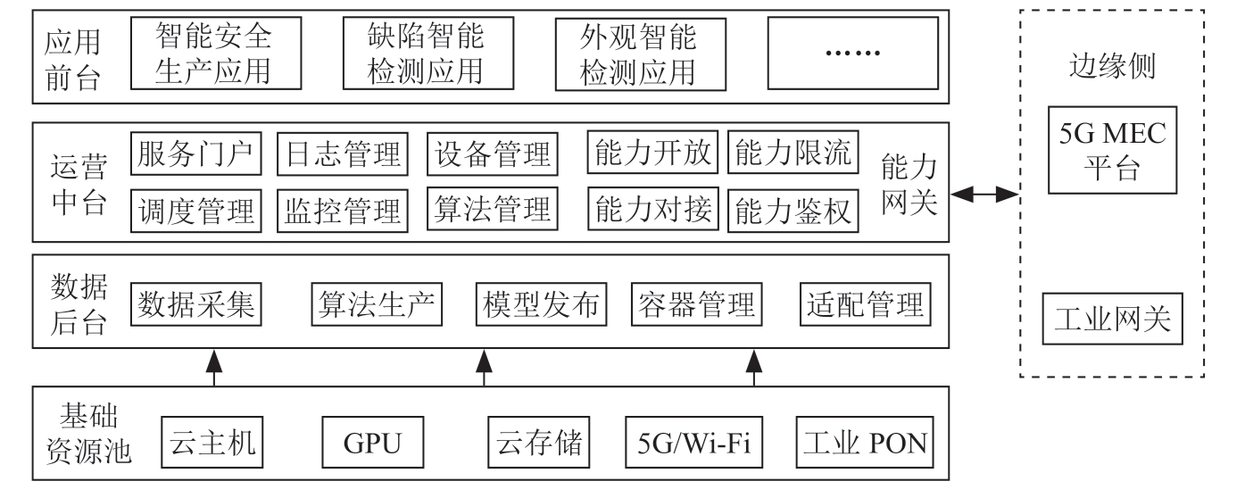 此外,为了实现工业场景下的快速发布与部署,平台可采用5G MEC[4]或边缘智能终端实现云边协同,5G MEC和工业网关用于提供边缘测的算力。通过云边协同实现工业视觉应用与5G网络紧密融合,利用5G高带宽、低时延、大连接的特性,便于快速赋能产线业务,同时也满足移动化智能应用场景需求。通过5G MEC能力,一方面可实现工业视觉平台AI能力的快速边缘化部署,为工业产线提供各种不同的产线AI质检能力;另一方面可实现产线推理结果的数据反馈,用于AI检测模型的优化提升,进一步形成线上与线下的正向循环[5,6]。