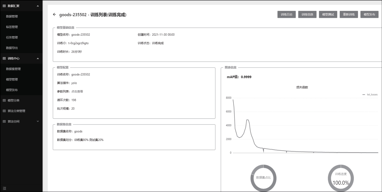 工业智能质检能力平台总体架构如图3所示,总体分为应用前台、运营中台、数据后台和能力网关。应用前台主要面向工业领域客户提供具体的应用服务,主要包括企业生产流程中涉及安全生产、工业质检、日常巡检等各类场景的机器视觉智能算法应用服务,一定程度上实现通用场景能力的跨行业横向复制;运营中台负责平台的运营、运维管理,主要包括配置服务门户、日常监控管理、算法管理、调度管理等功能;数据后台负责客户数据接入、AI算法生产、模型发布、容器管理及模型适配等功能;能力网关主要负责平台AI检测能力的开放和边缘侧平台及工业网关设备的对接。平台核心的功能界面如图4和图5所示。
