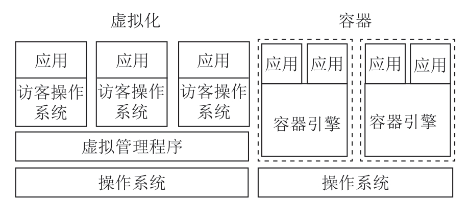 容器(container)是指隔离开的一系列进程,由镜像提供支持进程所需的全部文件。容器提供的镜像包含了应用的所有依赖项,因而在从开发到测试再到生产的整个过程中,它都具有可移植性和一致性。虚拟化使得多个操作系统可同时运行在单个系统上,而容器则可共享同一个操作系统的内核,将应用程序与系统其他部分隔离开,容器化的最大优势在于对于相同的硬件占用空间更小,可以比虚拟机运行更多的实例,如图2所示。