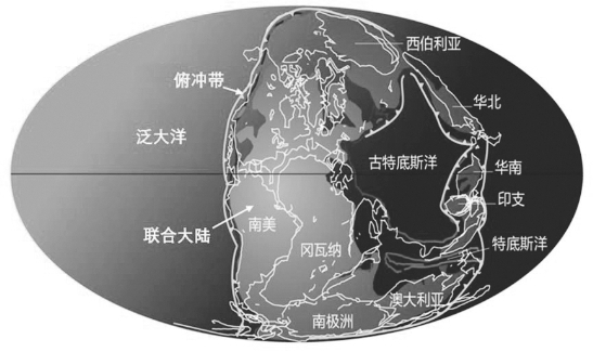 图2 2.5亿年前世界上的海陆分布,华南、华北都在联合大陆之外