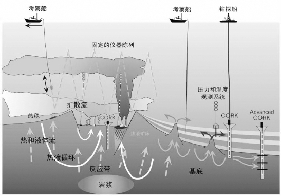 图2 深海观测系统的组成:海底、井下、船上观测设备的结合(CORK为“海底井塞”)