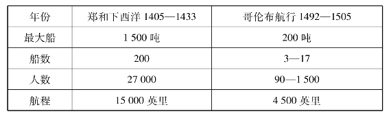 更令人感慨的是郑和下西洋。1405年郑和下西洋,当时确实是中国古文化的巅峰,也是世界航海史上的奇迹。郑和下西洋比哥伦布早了90年,郑和去了7次,哥伦布是4次。郑和的“宝船”1 000多吨,哥伦布的船是200吨。郑和是200艘船,哥伦布的是强盗船,多的时候10多条,少的时候3条。我们是2万多人,他是几十个人,多的时候是1 000多人。郑和的航程是哥伦布的3倍(如下表所示)。但是,不得不承认,郑和的航行是以悲剧结束,世界上很少有人知道郑和。