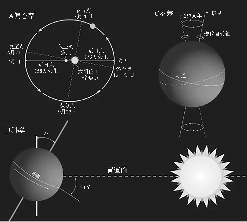 图1 地球轨道运动的三大参数:A.偏心率;B.斜率;C.岁差[13]