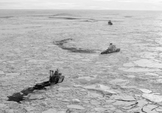 图3 俄罗斯原子能破冰船“苏联”号(上)、瑞典破冰船“澳登”号(中)和挪威破冰钻探船“维京”号(下)2004年在北冰洋大洋钻探中大战海冰