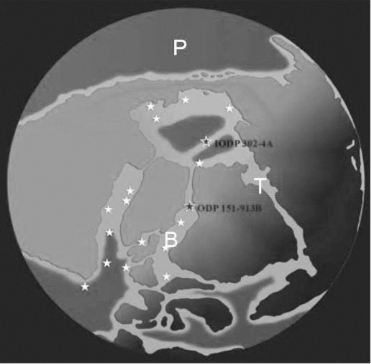 当时北极是一个湖泊型的封闭盆地,还没有形成大洋型的北冰洋。中灰色示陆地,浅灰色示浅水,深灰色示深水,T表示欧亚之间的图尔盖海,B表示北海的前身,P表示太平洋⑤