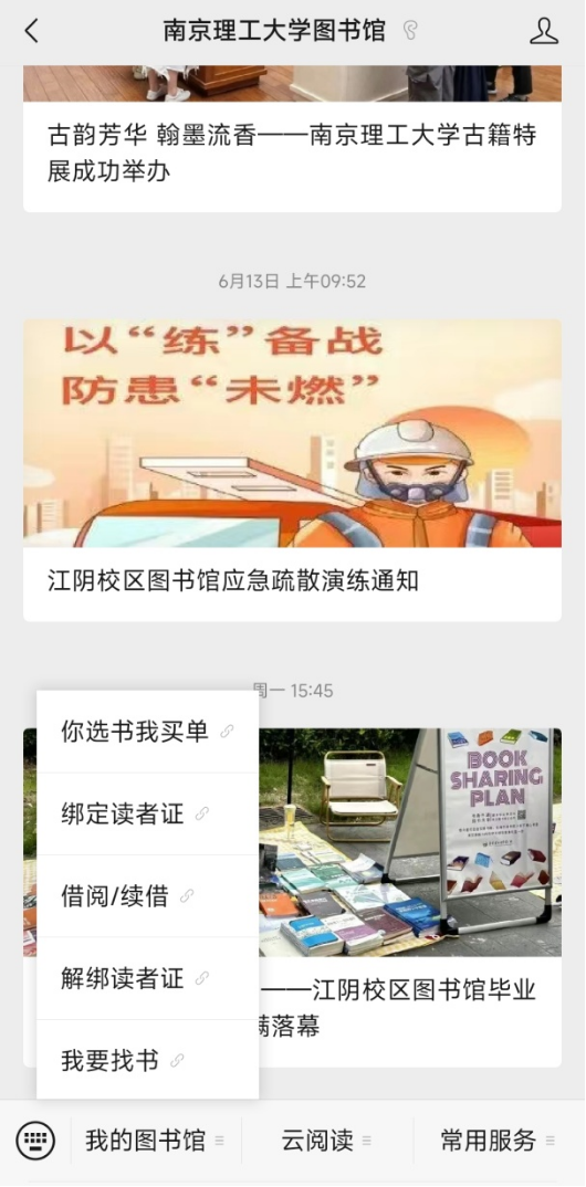 使用“南京理工大学图书馆”微信公众号进行续借操作时,需先绑定“读者证”。