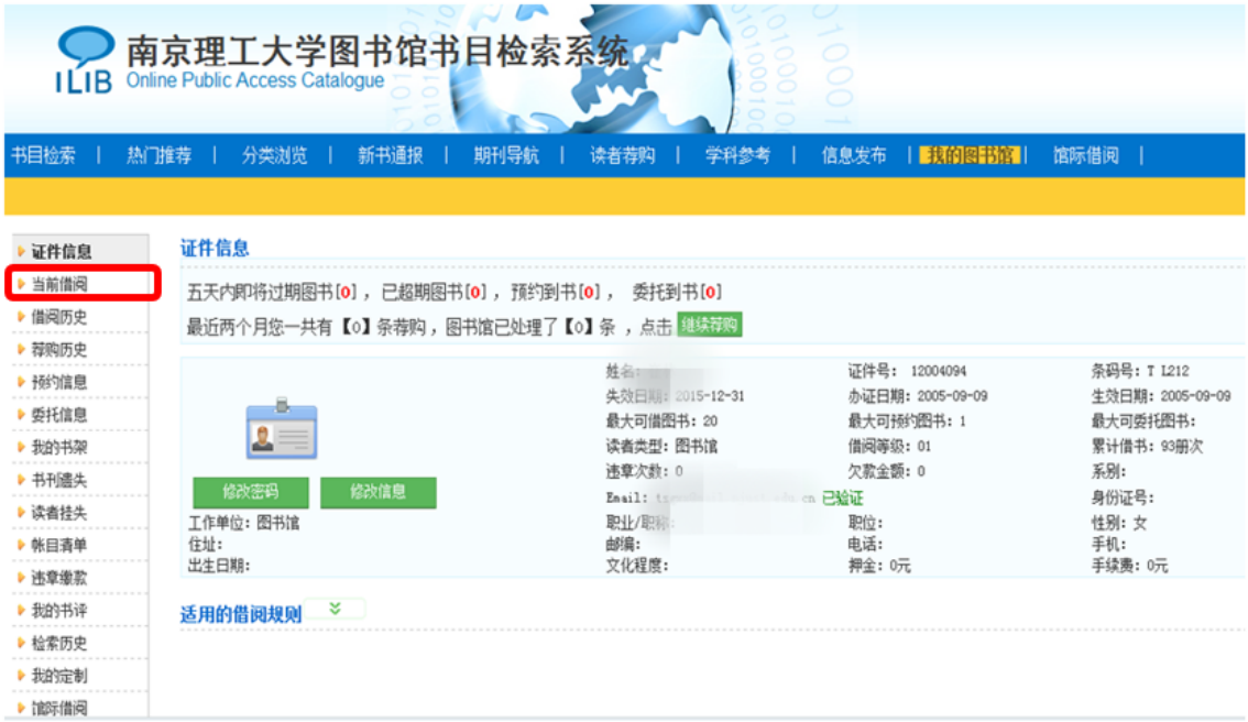 读者通过电脑/手机登录图书馆主页或“南京理工大学图书馆”微信公众号,利用“我的图书馆”进行个人借阅信息查询,以及图书续借等操作。