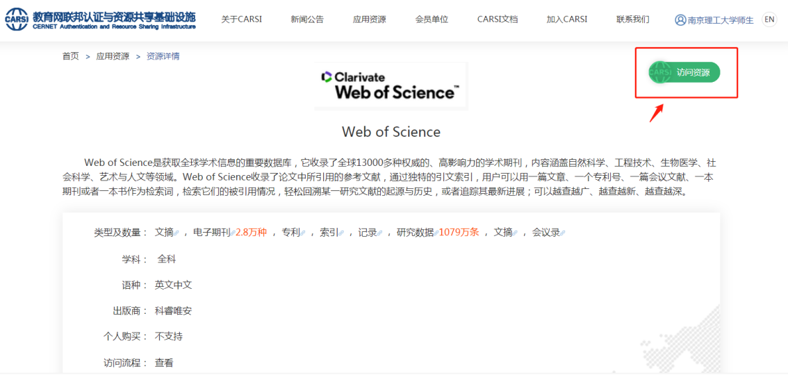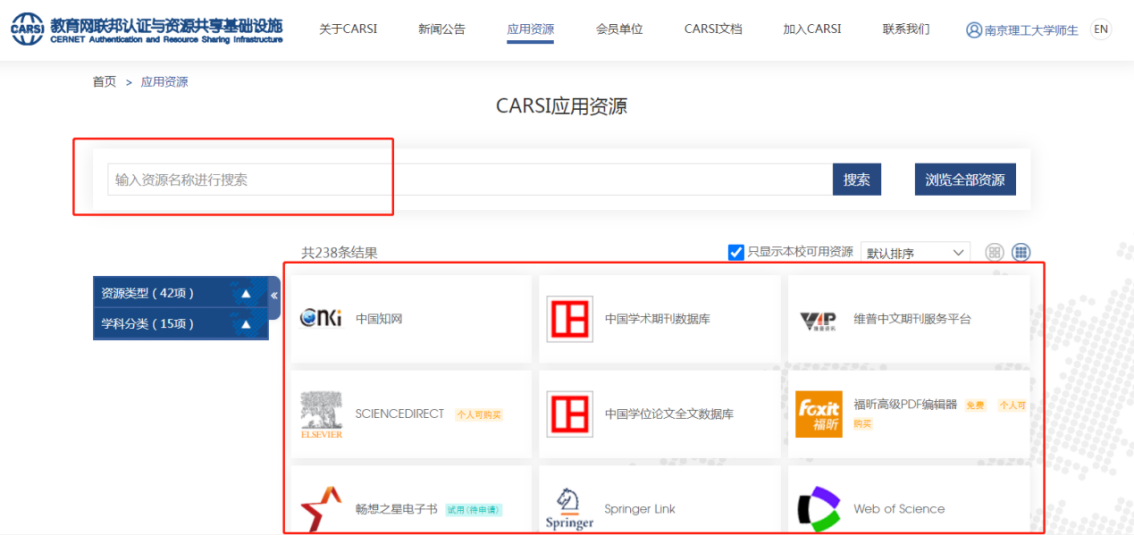 目前,在校园网外的师生,无须登录学校VPN,通过CARSI认证,使用智慧理工门户账号密码即可直接登录访问部分数据库资源。