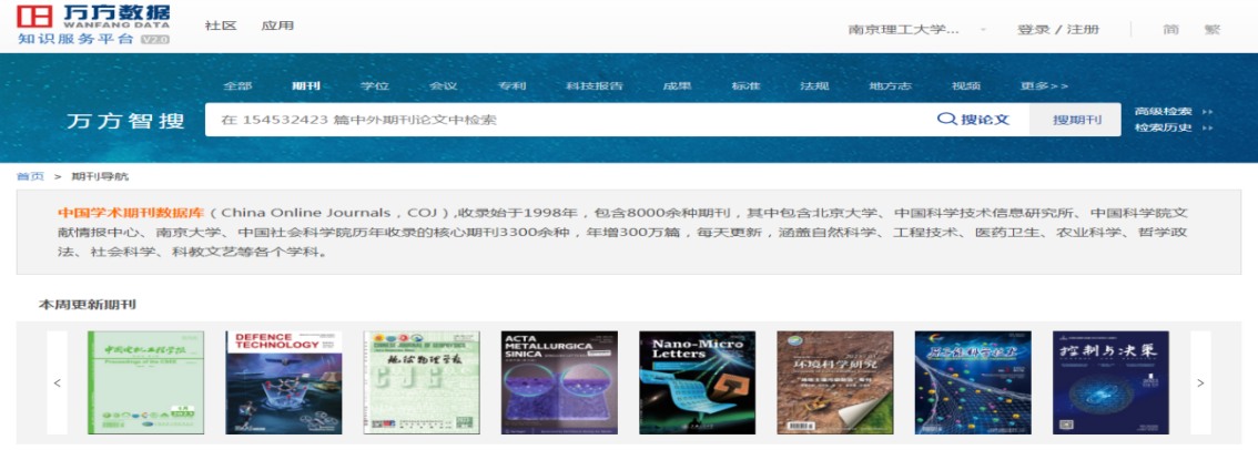 万方服务平台以自然科学为主的大型科技、商务信息平台,内容涉及自然科学和社会科学各个专业领域,数据实时更新。本校读者可使用的全文资源包括学术期刊、学位论文、学术会议、中外专利、科技成果、中外标准文摘。