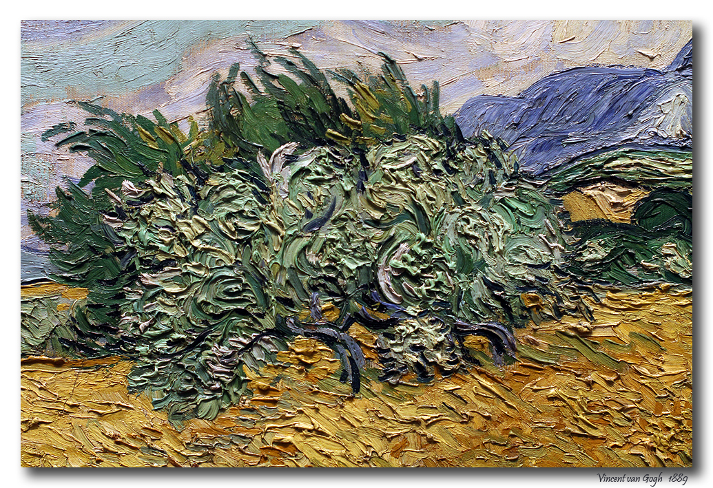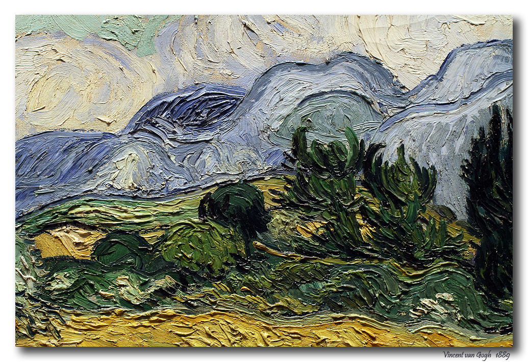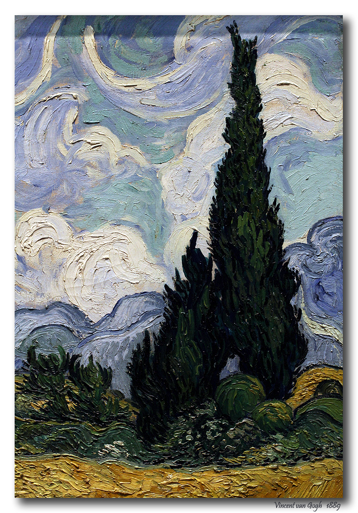 画作《麦田与柏树》是画家梵高创作于1889年9月初的一幅风景油画。现存于伦敦国家画廊。油画中那随风摇晃的柏树犹如擅动的灵魂,在大地和天空之间飞舞,那是灵魂深处的呼喊,那是对生活的渴望,那是对现实的无奈和悲痛欲绝。画家梵高一直想要表达的主题,就是生命与力量、梵高的作品总是充满压抑不住的·激动和热情,他经常运用飞舞的线条和强烈的色彩来抒发这种激情。在这幅画里道路旁的柏树就像黑色的火焰,这些卷曲着的线条相互扭结着窜向天空。柏树旁是一片金色耀眼的麦田,这是梵高最喜爱的色彩,因为它是太阳的色彩,生命的象征。梵高还用一种短促急速和旋转的线条,把天空和道路描绘成永不休止、滚滚向前的湍急河流。这些色彩和笔触表达出梵高内心的紧张和冲动,即使相当理智的人,也很难在这幅画前保持平静的心情。梵高的画并不深奥,也没有故作惊人之举,他只是用一种单纯平易的艺术语言,直抒他对自然和生命的热爱之情。正是这种亲切和真诚,使他的艺术具有经久不衰的魅力