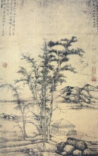 此画成时倪瓒年五十四岁。此为台北故宫博物院所藏倪画最早之一帧。画笔多用中锋,皴山以乱麻为主,盖究心董源,蘧蘧然正当蝶化而出也。款书亦用圆笔,结体偏於长形,与老年之作稍异。