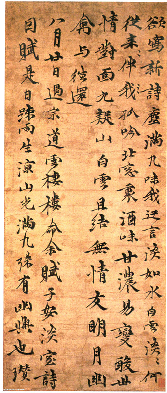 此书是倪瓒存世作品中唯一的一件大字行楷书,使用了极少见的立轴装裱形式。其书字形挺直,章法整齐疏朗,点画质朴遒劲,收笔顿挫有力,撇、捺尽量拉长,据书风判断应为其晚年之作。