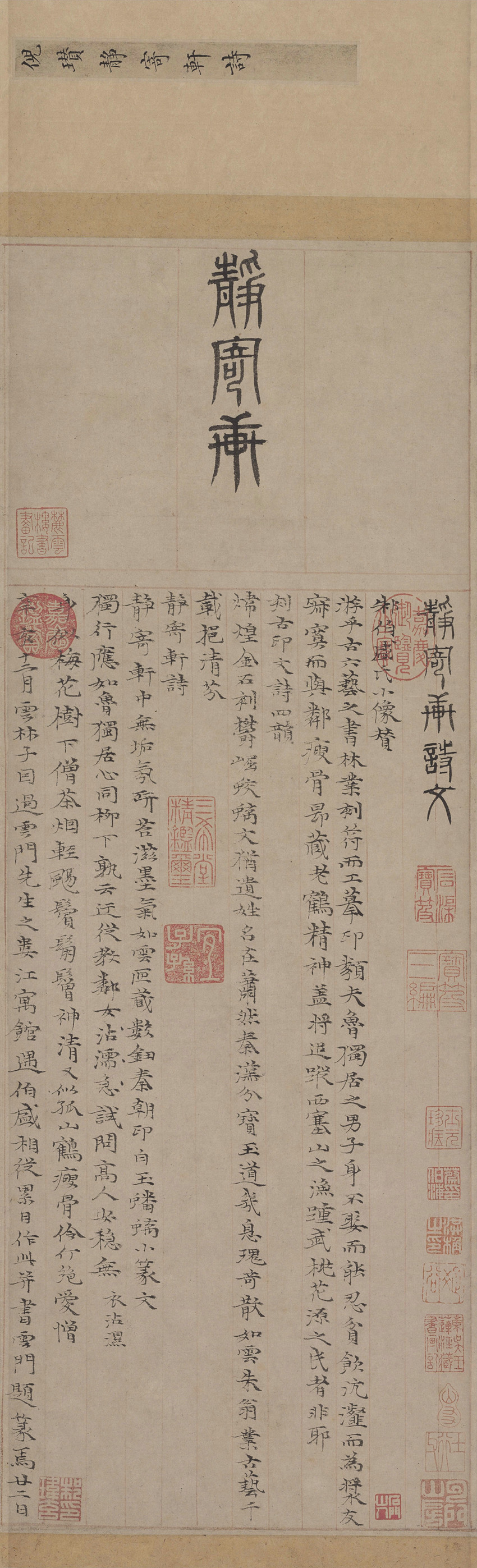 此帖上方篆书“静寄轩”和帖首篆书“静寄轩诗文”为张绅所书。“静寄轩”是邾伯盛的斋名,其人名珪,字伯盛,苏州人。师濮阳吴睿,习大小篆书,喜为人治印。