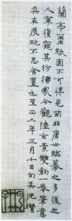 释文:兰亭茧纸固不可得见,苟非唐世临摹之多,后之人宁复窥其仿佛哉。今观陆玄素双钩一卷,笔意具在,展玩不忍舍置也。至正二年正月十日,勾吴倪瓒。