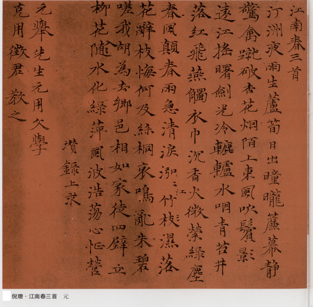 相比于其他小楷作品,此帖用笔属工稳严谨一类。小楷多露锋起笔,于起收处尤为强调,虽瘦犹劲,细处若蚊睫而无懈怠之嫌,且有丰富的变化,这种对笔毫精熟的驾驭能力实令人叹服。由于结字多取扁势,故字之撇捺多夸张式的横向伸展,灵动有致。字形大小,长扁、收放自然错落,秩序中不乏活泼之趣。倪瓒贵在能够突破唐楷那种法度森严的规矩,直追六朝古法。此帖章法采用纵有行、横无列的布局方式,以疏朗为主,配合笔画的灵动飘逸,参差错落,营造出一番萧疏散逸的意境。