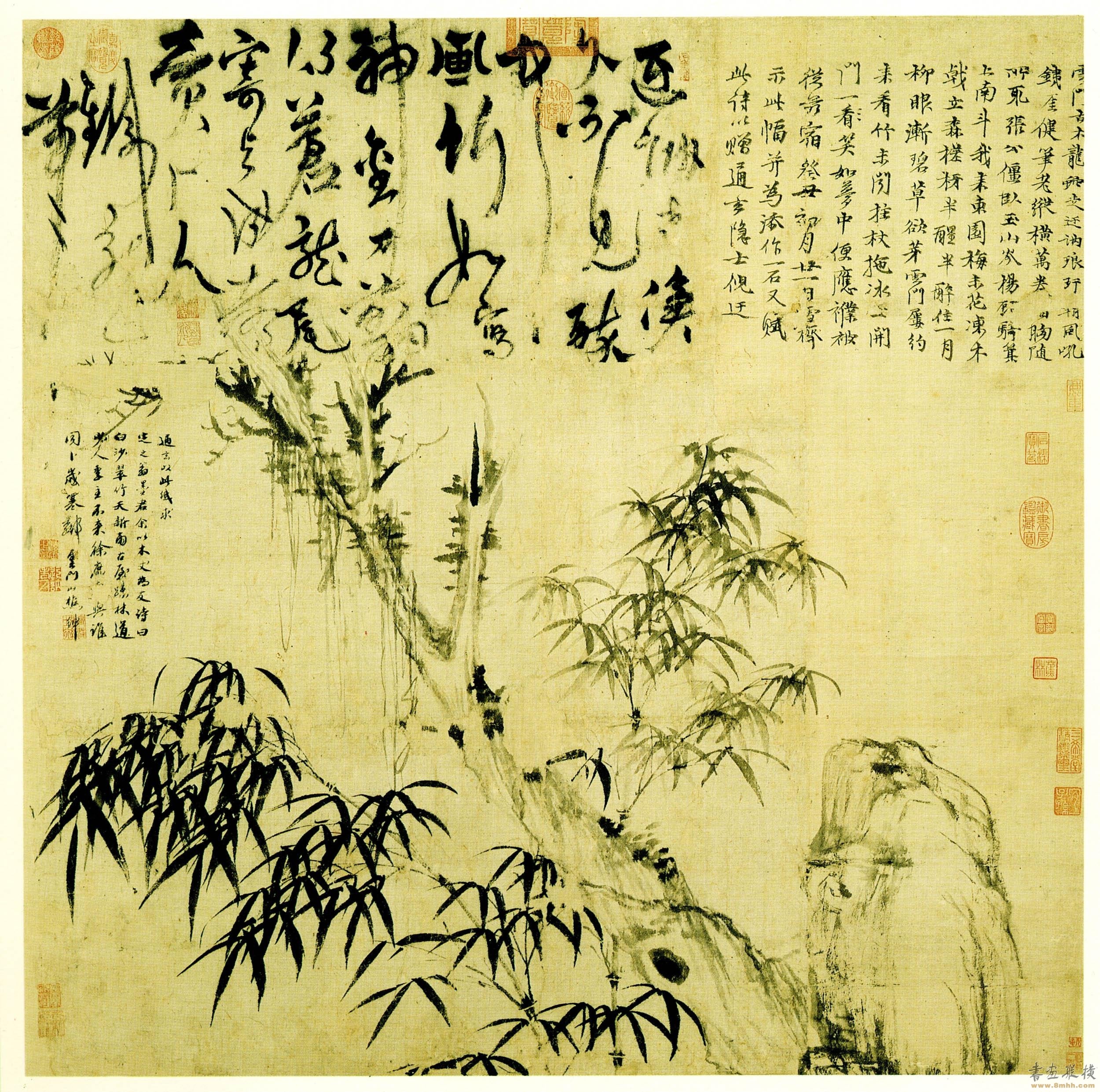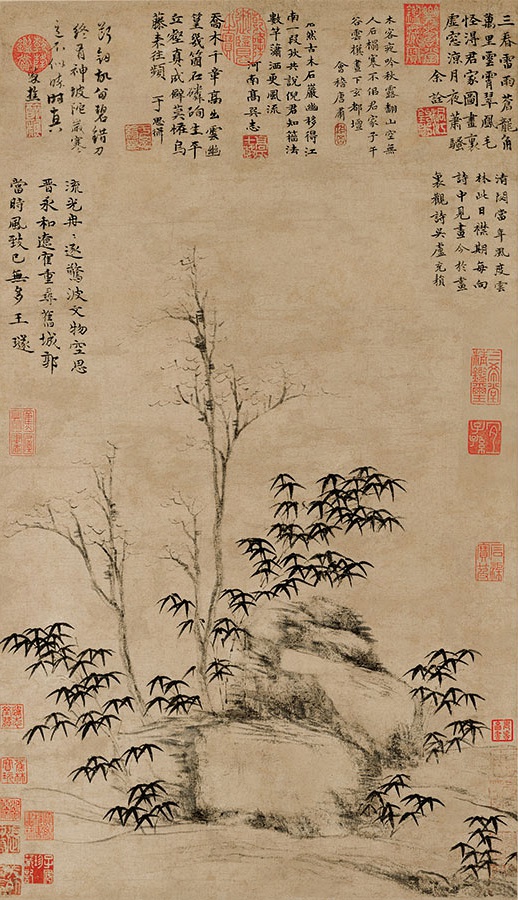 此图绘坡石间疏竹数丛,枯树两株,笔墨浓淡相间,富有层次感,境界清旷,意境简远,呈现出一片清静幽远的气象。