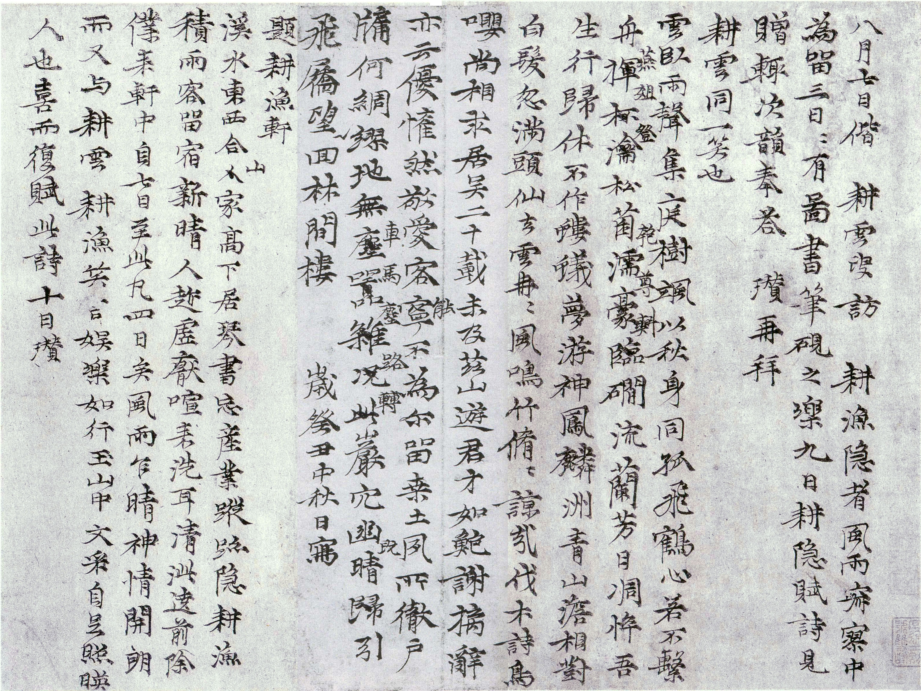 本诗札上虽无纪年,据倪云林诗集及有关其活动的记载。本札写于1373年八月。该年八月七日,倪云林偕耕云访耕渔隐者,其间八月十日,诗题《耕渔轩》,十一日题《怀素酒狂帖》、十五日写《耕云图》,又次韵耕渔奉答。倪云林在耕渔轩中与耕云等观赏品题书画、弹琴赋诗,是他晚年难得的一次雅集。