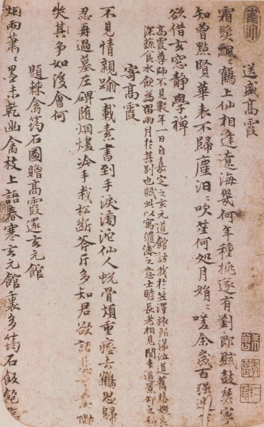 倪瓒此《八诗帖》无纪年。是其诗稿的一部分。据帖后跋:“云林诗稿自少至老字稍异。早年楷法极工,晚年渐草率。全稿向在王弁州家,后散失。城外周民藏一册,诗颇多而字不如也。此八首得之无锡华氏。”从书迹看此《诗帖》与《自书诗稿47首》不是同期作品。本帖所录八首,载《清圈阁全集》卷四、卷六。其中《赠君震》一首全集不载。《契兰堂法帖》卷七,题为《自书诗七首》。