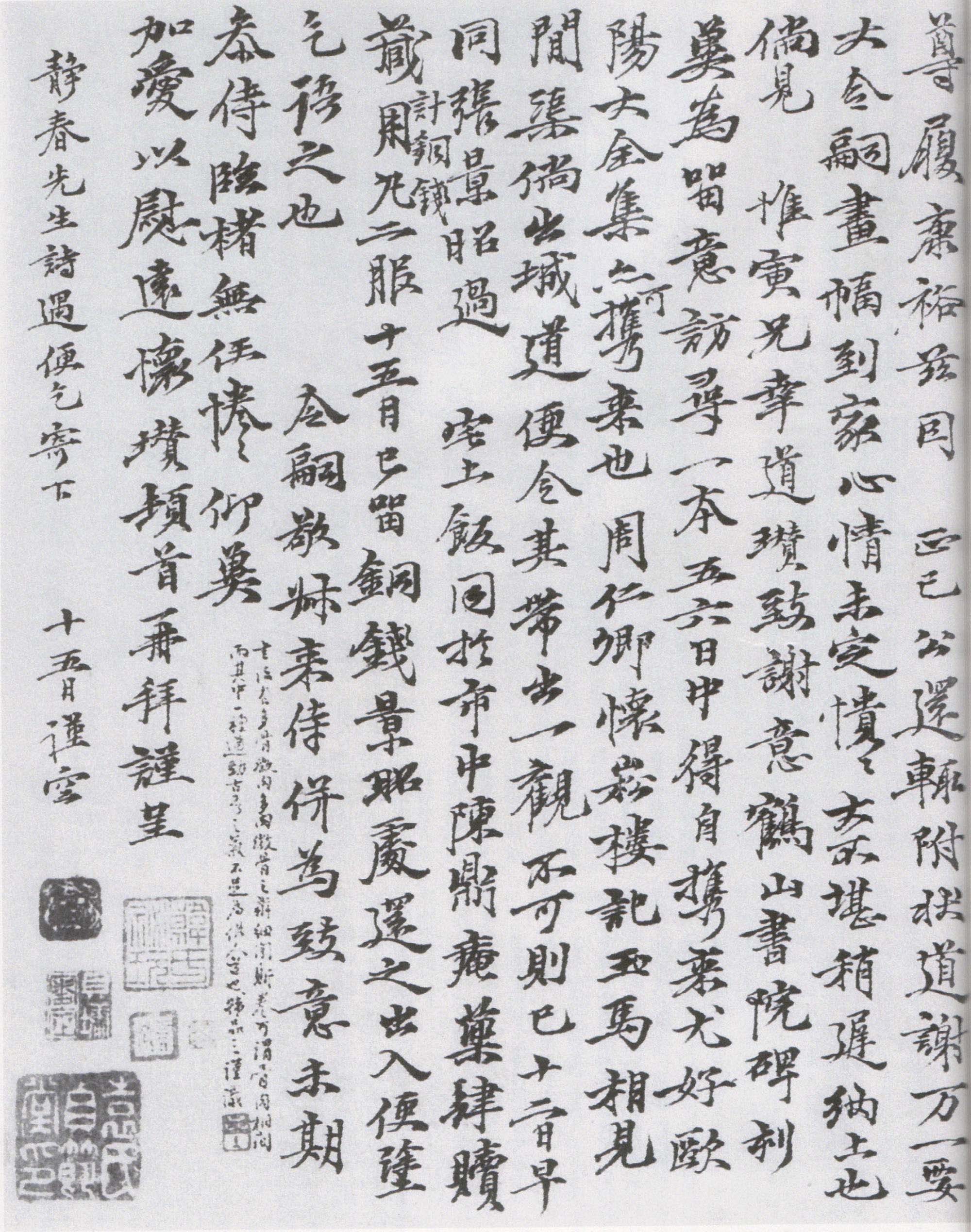 这是倪云林在赠袁寓斋画后的信札。当年十月二日,倪云林写山水一幅赠寓斋,又三天,书简札一纸。叙了对寓斋的思念之情,又交待了几件小事。其中一件是希望寓斋将静春的诗寄给他。寓斋就是袁泰,字仲长,吴郡人。他的父亲袁易(1262—1306)字通甫,是元初诗人。所居吴淞太湖之间,筑堂日“静春”,聚书万卷,手自校定。所著有《静春堂诗集》四卷。鲜于枢赞袁易的诗“命意闲远,下语清丽”。倪云林就是要看寓斋父亲的诗集。倪瓒赠袁寓斋的画仅尺幅,跋字居其半。画、书合卷装裱,故《虚斋名画录》作《书画合壁卷》.