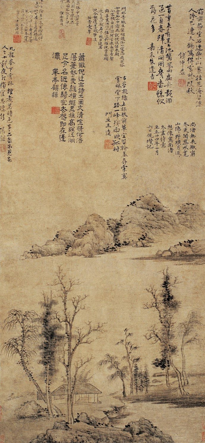 倪瓒自题:“南渚无来辙,冬更寥,水宽山隐隐,野旷月迢迢。想象写南渚冬尽诗意。至正二十四年十月六日。倪瓒记。”