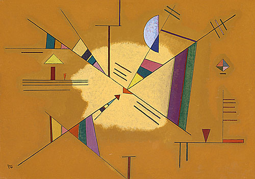 康定斯基在第一次涉足于抽象之后,就再继续坚持这个方向,但在1912年的作品《带黑色的弓形》中,特定的主题和视觉的联想都消逝了。这幅画中所显示的猛烈冲突的动势和紧张,是色彩和形状的互相冲突和紧张,犹如某种星际大战似线条的冲突和紧张。从这一点出发,艺术家继续创作了一系列的抽象表现主义绘画杰作。在1913年以后,由于第一次世界大战的压抑感,又使他偶尔回到重新介绍客观物体上来,如《即兴(大炮)》,只是这种物体愈来愈变得稀少。事实上,这种大炮,以图画的抽象要素去表现爆炸破坏的感觉,已没有实际必要。在这里再介绍一下1914年他的大型季节系列画《秋》和《冬》。《秋》的色彩更为浓重得当。《冬》在小碎色块的加速运动和旋转、交错、飞溅式的线条方面更为活泼、生动。艺术家通过表现手法,甚至是抽象手法的描绘力量,提示了季节的某些特征。