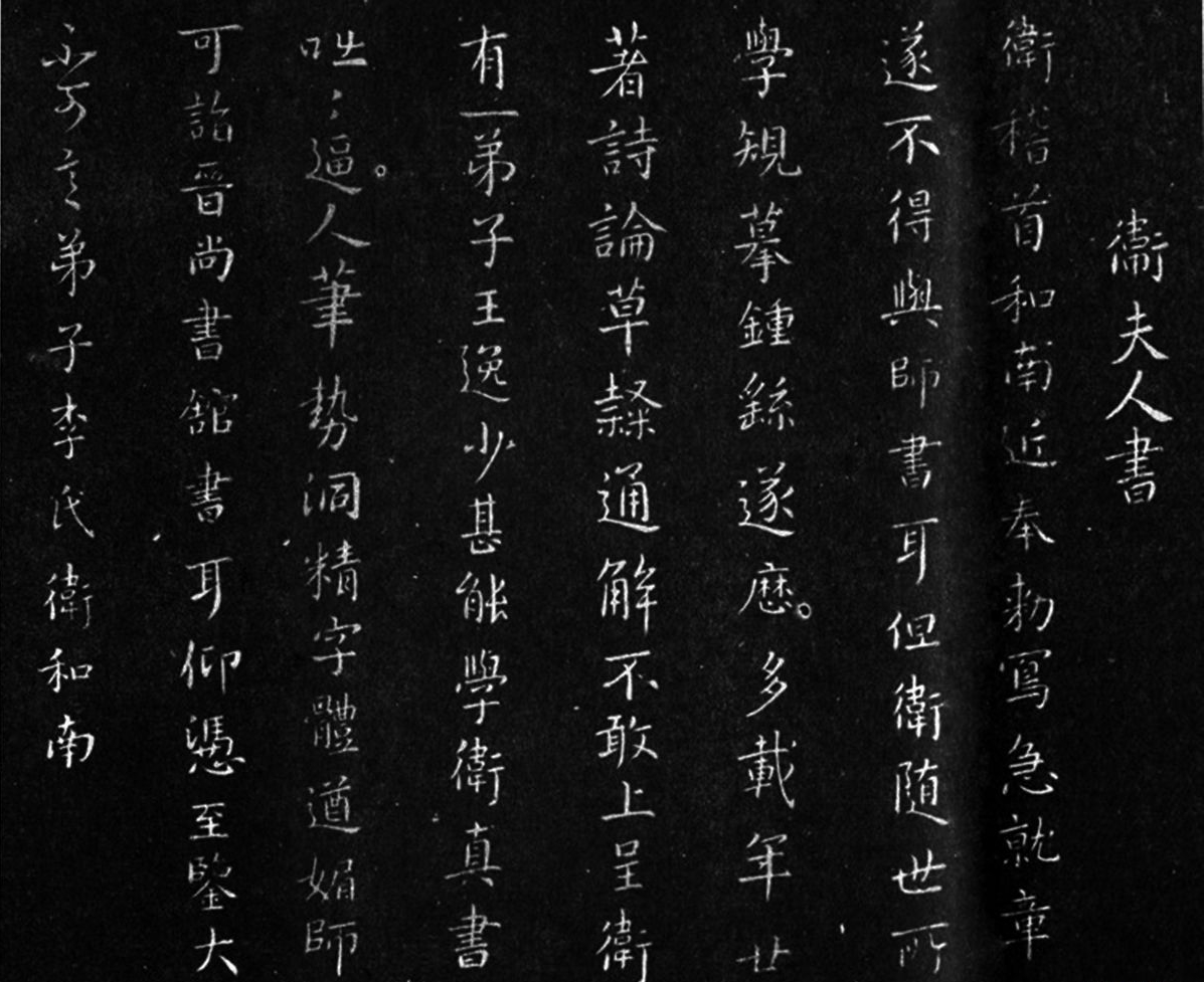 簪花小楷,卫夫人所创。钟繇评之曰:“碎玉壶之冰,烂瑶台之月,婉然若树,穆若清风。”充分肯定了卫夫人书法高逸清婉,流畅瘦洁的特色。这实际上是对钟繇书法风格的继承,但在钟繇瘦洁飞扬的基础之上,更流露出一种清婉灵动的韵味。唐代韦续则曰:“卫夫人书,如插花舞女,低昂芙蓉;又如美女登台,仙娥弄影;又若红莲映水,碧治浮霞。”连用三组美丽的形象来比拟其书法。